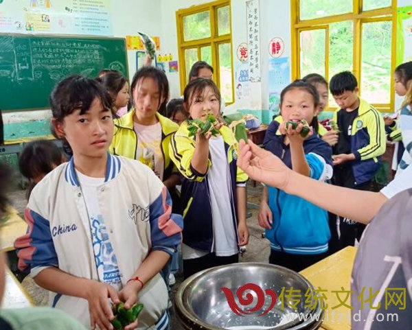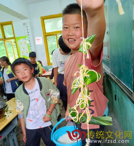端午节前夕,班主任朱凤老师到米店买了20斤糯米和线绳,安排家里有粽叶的学生自带粽叶。包粽子的材料备齐后,全班学生在班主任老师的组织下就开始包粽子了。