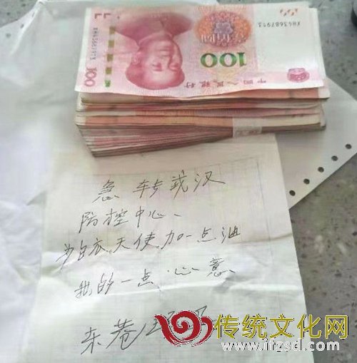 今天(1月31日)上午11时许,日照市东港环卫一老大爷来到东港公安分局西湖派出所,放下一个纸包就跑了,派出所民警打开纸包一看,里边是一摞钱,还有一张纸条,上边写着:急转武汉防控中心,为白衣天使加一点油,我的一点心意,东港环卫。