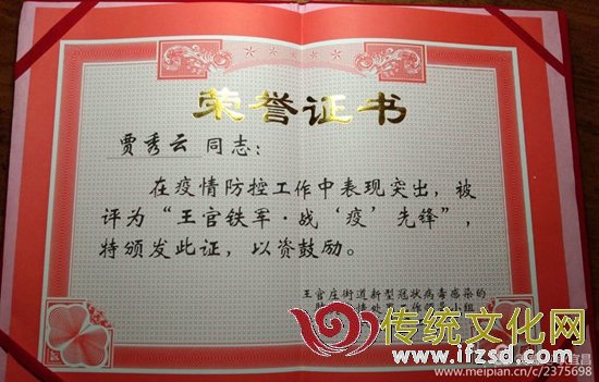近日,她被王官庄街道新型冠状病毒感染的肺炎疫情处置工作领导小组评选为“王官铁军·战 ‘疫’先锋”。