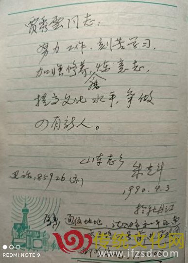 朱光斗老师来牡丹江是给基层部队培训文艺骨干的,因为同是山东人,家乡仅隔一县之地,有缘相识彼此显得特别激动,交流起来也是浓浓的乡音;温暖、朴质、和蔼、热情的光斗老师,有时候会绘声绘色地给她讲雷锋的故事,引导着她要做“四有革命新人”。在培训班上由朱老师授课的时候,总是忘不了叫着她来旁听,就这样他们相处了2个月的时间。临别时光斗老师紧紧地拉着贾秀云的手,鼓励她要走雷锋之路,做雷锋的传人。