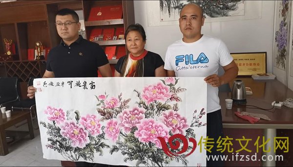 原来,河南遭遇特大暴雨袭击并发生严重洪涝灾害后,给人民生命财产安全和生产生活带来了巨大损失和严重影响,济南市中区党家庄街道办事处党东村和党西村有30多名志愿者自发组织,出车、出人、出钱、出物,远赴河南新乡等地捐献救灾物资,首都书画院秘书长、著名写意花鸟画家何俊花在得知援豫志愿者们胜利归来的消息后,激情挥毫泼墨,连夜绘制创作了牡丹、兰花等50多幅国画艺术作品,于7月31日在党家西村村委会捐赠给了援豫志愿者们。为衷心感谢何俊花对援豫志愿者捐赠国画作品的无私奉献精神,援豫志愿者代表法代超和杨兆斌也联合赶制出一面锦旗赠送给何俊花,于是就出现了开头一幕。