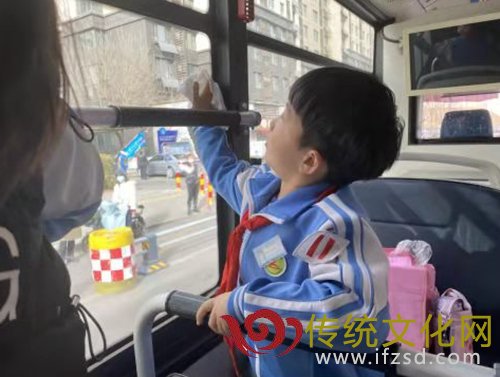 队员们走进公交公司,擦拭每日乘坐的定制公交座椅、窗户,奉献一己之力,增强小主人翁意识。