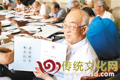 老教授文占申展示精心书写的录取通知书。陕师大供图