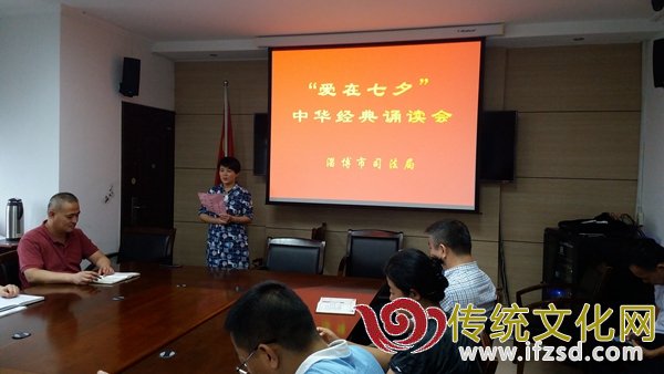 传统文化网淄博讯(特约记者 韩永勤 通讯员 周荣光) 8月28日是中华民族传统节日——七夕节。为了传承和弘扬中华民族优秀文化,教育和引导广大干部职工认知传统、尊重传统、继承传统,让机关广大干部职工充分感受浪漫爱情的节日氛围,8月28日下午,淄博市司法局组织举办了一场别开生面的“爱在七夕”中华经典诵读会。诵读会由市司法局党委委员、副局长刘长军主持,市司法局党委书记、局长常跃之等领导班子成员、机关全体干部职工和山东省湖田监狱、市鲁中公证处、市法律援助中心等共计50余人参加了诵读活动。