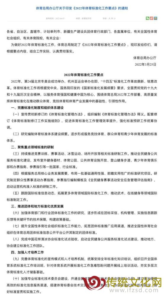 7日,国家体育总局网站发布《2022年体育标准化工作要点》的通知,其中明确提到,推动武术、在线健身等领域国际标准制定工作。