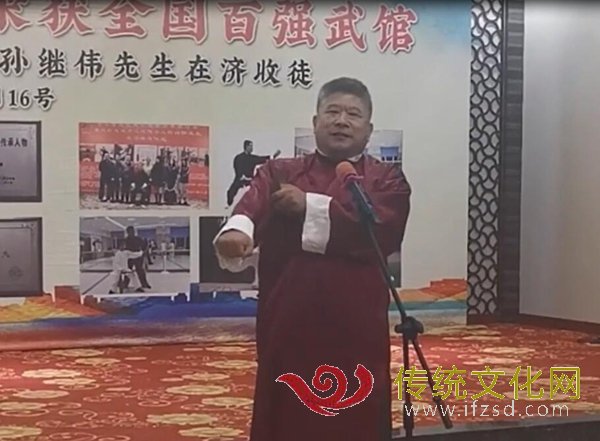 宋氏形意拳第三代传承人孙继伟在致辞中表示,五年来,武源体育成功地举办了武术进校园、武术进社区公益活动300多场。连续五届的华山论剑已成为济南市地域性体育品牌,成功举办了中国交峰会、海峡两岸武术交流会、形意拳研讨会,得到了社会的认可。孙传宋氏形意拳也成功申请了非物质文化遗产。今天,我们又获得了全国百强武馆。我个人也荣获中国好功夫百强,并成为中国武术非物质文化遗产传承性人物。这些成绩离不开各位领导的支持,离不开各位同仁的帮助。没有你们就没有武源体育;没有你们,就没有我孙继伟的今天。我将带领60多位徒弟、1000多名学员、3000多名学生,将带领他们和平年代强身健体,战争年代保家卫国!