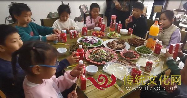 孩子们演练结束后,精美的菜肴和热腾腾地水饺也端上了桌。在爸爸妈妈的关爱中,孩子们一张张的笑脸,满满的坚毅和自信,大家你谦我让,边吃边交流着练武心得,畅谈着人生理想。
