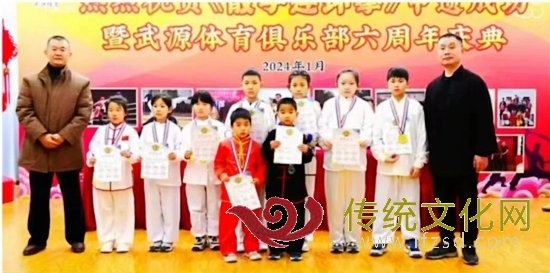 在庆祝武源体育俱乐部清河新居青少年武术队在济南市第24届青少年武术比赛中共夺得8金3银的好成绩活动中,济南市少年宫武术指导肖明希和济南市武源体育俱乐部董事长孙继伟分别向金牌获得者姜辰雨、田首雅、张素荣、李肇滨、周朔彤、张杨博宸、杨家葳、杜浩天和银牌获得者杜欣雨、肖策、赵嘉铭等颁发了奖牌和荣誉证书。