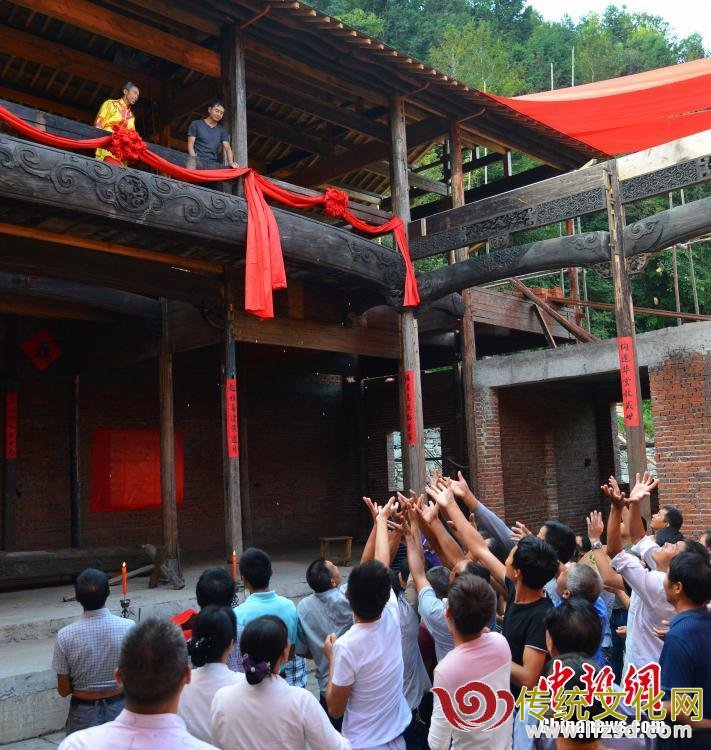 9月24日,江西省婺源县瑶湾村村民在新建房举行“上梁”仪式,十里八乡的村民聚集在一起“叫彩”。