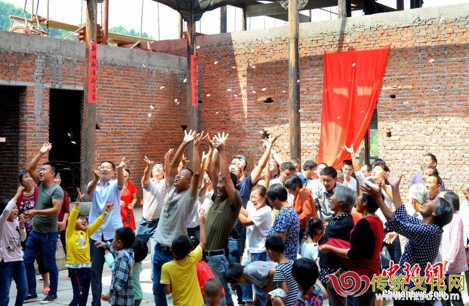9月24日,江西省婺源县瑶湾村村民在新建房举行“上梁”仪式,十里八乡的村民聚集在一起“叫彩”。程新德 摄
