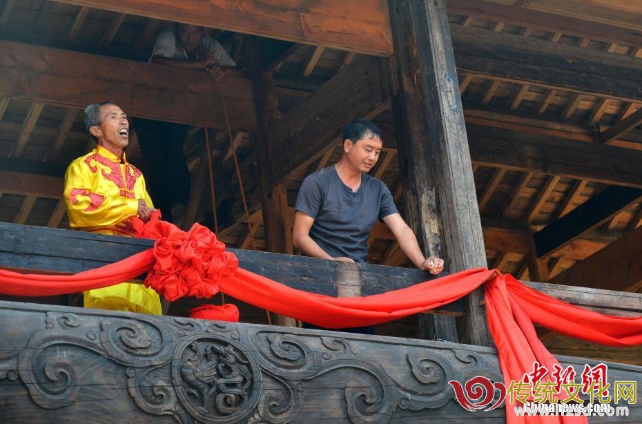 江西婺源古属徽州,民间建房有别具一格的传统风俗,其中“赞梁”,“祭梁”,“上梁”等环节,场面隆重而又热闹,且有浓郁的祭神色彩,至今仍在乡间沿袭。程新德 摄