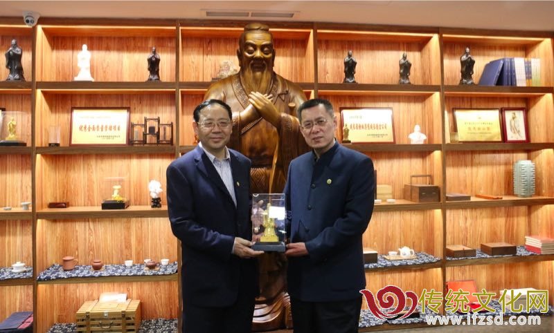 王大千理事长(右)向孔学堂徐圻理事长赠送孔子像。摄影 张有水