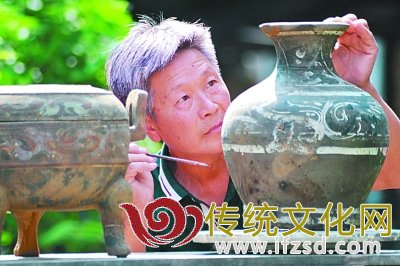 山西省级非遗传承人农民赵林堂在彩绘陶艺工艺品。光明图片/视觉中国